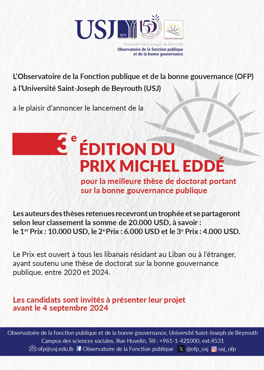 L’Observatoire de la fonction publique et de la bonne gouvernance (OFP) de l’Université Saint-Joseph de Beyrouth (USJ), a le plaisir d’annoncer le lancement de la troisième édition du Prix Michel Eddé pour la meilleure thèse de doctorat sur la bonne gouvernance publique.